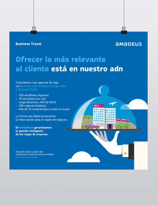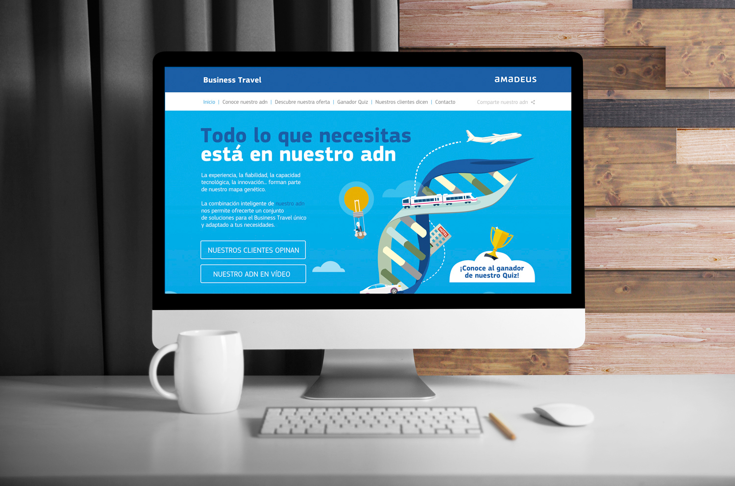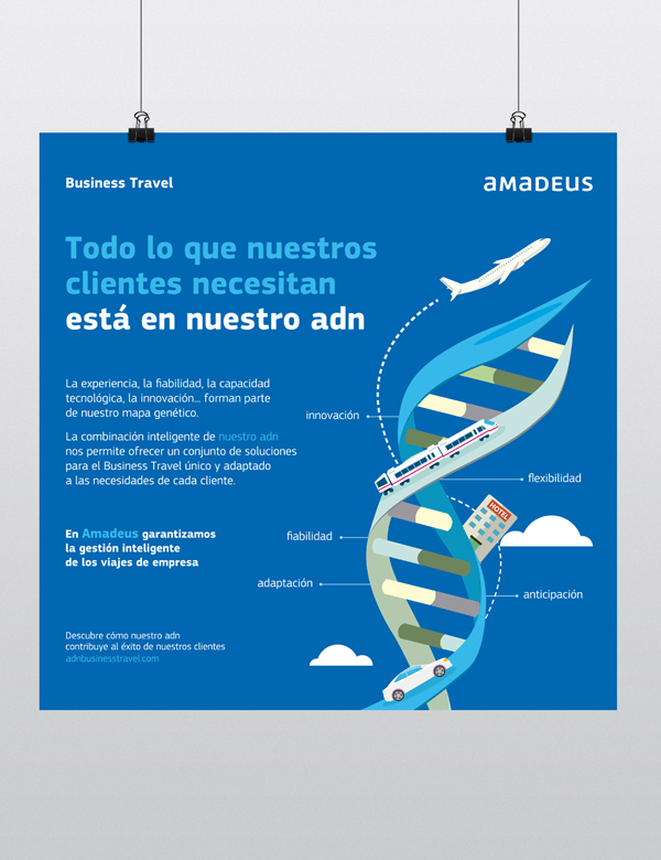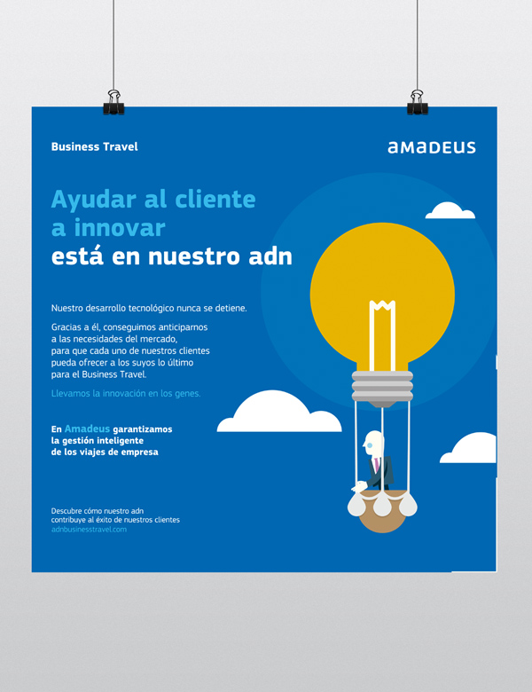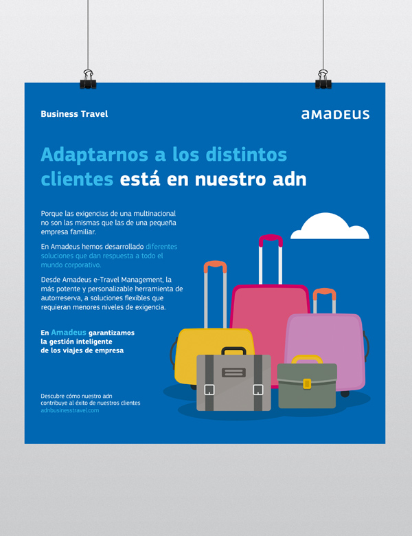 En verano de 2014, realizamos en la agencia una campaña para Amadeus, líder en soporte tecnológico dentro del sector del viaje. Con unas guidelines recién estrenadas, realicé la dirección de arte de esta campaña, además de ilustrar, montar vídeos, diseñar la cartelería o el microsite. El resultado fue muy fresco, y le dio mucha vida a la marca creada por Interbrand.