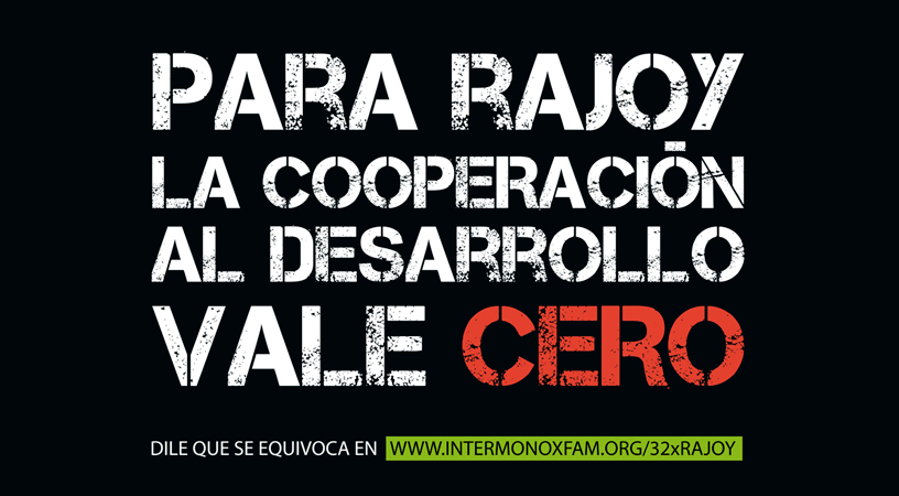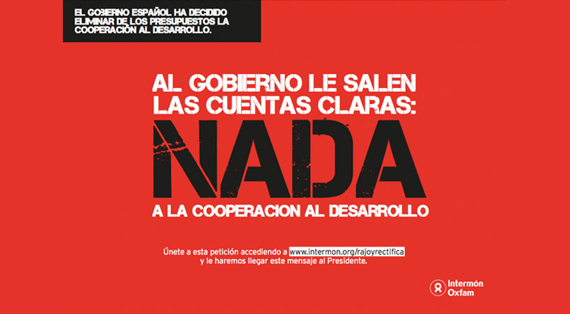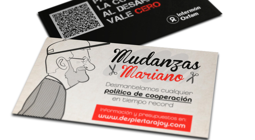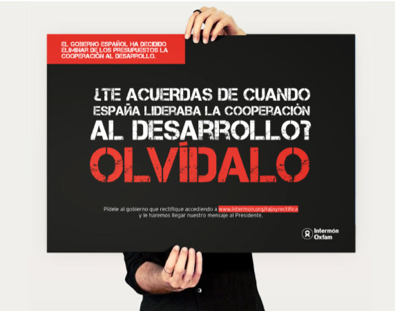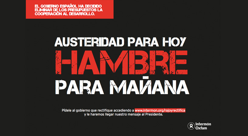 En la agencia realizamos una campaña para Intermón Oxfam con la que se denunciaba la bajada de la partida en los presupuestos generales del estado destinada a la cooperación al desarrollo. Aunque Intermón se quedó con solo uno de los copies que les presentamos, en realidad desarrollé una serie de carteles basados en distintas frases "lapidarias". Una vez en marcha la campaña, también me tocó realizar una caricatura del presidente para ilustrar una de sus piezas.